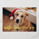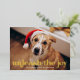Cuta tarjeta de vacaciones con tema de perro con la foto horizontal de tu perro con "desata la alegría" mostrada en negrita con letras de Relieve metalizado dorado. Personalice la tarjeta de Navidades de perro agregando un saludo personalizado y su nombre. La tarjeta se invierte para mostrar un patrón de impresión de pata roja y blanca.