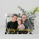 Tarjeta de vacaciones de papel de oro. Esta elegante tarjeta postal de Feliz Navidad con papel de oro presenta un marco festivo de copos de nieve blancos con texto y letra de papel de oro para personalizar sobre una foto familiar personalizable. La parte trasera incluye un mensaje para personalizar sobre un fondo verde bosque. Encuentre artículos coincidentes en la Colección de Copos de Nieve de Navidad.