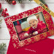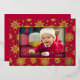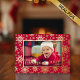 Elegante tarjeta de vacaciones de Relieve metalizado fotográfico con copo de nieve. Una tipografía de escritura rápida ortografía Primera Navidad y el nombre y año de tu personalizable también en Relieve metalizado real. Añade tu foto, la foto de la Sombra en el interior del marco dorado da un efecto 3D a la foto y encuadre Tierra moderna, clásica y tradicional de invierno con Relieve metalizado cayendo copos de nieve sobre un fondo rojo. Las opciones de Relieve metalizado son Gold, Silver y Rosa Gold. Personalizar el texto, el texto posterior es opcional o suprímase. Un recuerdo para los nuevos padres, familia y amigos.
