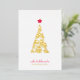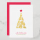 El frente de esta impresionante tarjeta de Navidades presenta un diseño verdaderamente único y elegante, un árbol de Navidad hecho enteramente a partir de hojas de Relieve metalizado dorado monstera. Cada hoja está cuidadosamente estratificada para formar la forma triangular clásica de un árbol de Navidad, con los detalles intrincados de las hojas de la monstera bellamente resaltadas en el Relieve metalizado de oro radiante. En la parte superior del árbol, donde normalmente se sentaba una estrella tradicional, una vibrante flor de hibisco rojo ocupa el centro del escenario. La flor de los hibiscos añade un toque de color perfecto, simbolizando el espíritu tropical y la alegría de la temporada. El fondo es un blanco nítido y limpio, lo que permite que el Relieve metalizado dorado y los colores vibrantes se destaquen con una claridad impresionante. El diseño combina elementos atrevidos y tropicales con la refinada elegancia del oro, creando una carta sofisticada y llena de calidez insular.