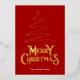 Tarjeta de Navidades de Relieve metalizado dorado con Feliz Navidad en estilo guion y diseño de árbol. Puede introducir el nombre de su familia y cambiar el color de fondo rojo si lo desea.
