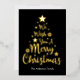 Le deseamos una Feliz Navidad con un tipo de letra en forma de guion en una tarjeta de Navidades de Relieve metalizado oro en forma de árbol. Puede introducir el nombre de su familia y cambiar el color de fondo negro si lo desea.