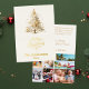 Un fondo beige y blanco roto. Decorada con un árbol de Navidad cubierto de nieve. Real Relieve metalizado de oro en el frente. Su texto y nombres en la parte posterior. Feliz Navidad se escribe con un tipo de letra con letras a mano. Regreso: saludos a amigos y familiares. Un collage de fotos de 7 de tu año en revisión.