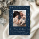 Illuminate your holiday greetings with this enchanting and modern photo card, capturing the magic of a starry night! The deep navy blue background is covered in a dazzling, all-over pattern of twinkling stars and sparks, all beautifully accented in bright silver foil. Your favorite family picture is elegantly framed, while the handwritten-style "Merry Christmas" script glows in brilliant silver foil, giving your card a truly festive and shimmering finish.