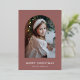 Envíe saludos de vacaciones de moda con esta moderna tarjeta de fotos navideña con su foto vertical enmarcada en un polvoriento arco rosa acentuado por un elegante Relieve metalizado de oro rosa. "Feliz Navidad" se muestra en el guión de Relieve metalizado de coordinación, con el nombre de tu familia y el mensaje de personalizado que se muestra abajo en letras blancas. La parte trasera incluye un suave patrón de nieve blanca, creando un diseño romántico y elegante para unas vacaciones perfectas para compartir deseos cálidos.