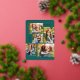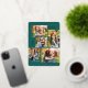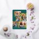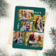 Esta elegante tarjeta de cinco Navidades de collage de fotos presenta tipografía moderna de lectura, PAZ, ALEGRÍA y AMOR en Relieve metalizado de oro real sobre un oscuro fondo verde azulado (el color puede ser personalizado a cualquier color que quieras). La parte posterior de la tarjeta contiene un patrón de árboles de Navidad falsos Relieves metalizados sobre un fondo de color personalizado (mostrado en blanco).
