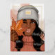 Tarjeta de vacaciones de Acción de Gracias/Año Nuevo de otoño - caída con influencia afroamericana personalizable según tus especificaciones. Celebra la belleza del otoño con esta tarjeta elegante que presenta a una mujer afroamericana con un suéter de cuello alto y un gorro acogedores, sosteniendo una hoja de arce naranja con un guiño juguetón. Acentuado con un borde de foil real y un año "20XX" personalizable en dorado, plateado o dorado rosa, este diseño es perfecto para enviar cálidos y elegantes saludos de temporada o de Acción de Gracias.