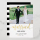 Tarjeta de felicitación navideña moderna "Casados y Alegres" para recién casados que incluye un retrato del día de la boda, hoja de oro y texto personalizado negro que se puede personalizar con nombres y fecha de la boda. Un pequeño corazón de hoja de oro adorna la parte delantera y un patrón atrevido de rayas horizontales en blanco y negro adorna la parte posterior.