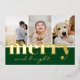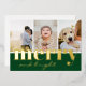 Tarjeta de vacaciones elegante y moderna de Navidad con lámina de oro real con tres fotos y felicitaciones de Navidad en oro sobre un fondo verde festivo: Alegre y brillante, en una mezcla de tipografía clásica y letra manuscrita moderna y chic. El reverso de la tarjeta contiene tu mensaje de Navidad personalizado en fuente moderna, negro sobre blanco. Personaliza esta plantilla minimalista única haciendo clic en el botón ´´Personalizar´´.