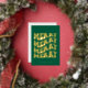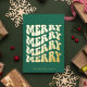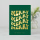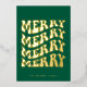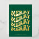 Tarjeta de Navidad Merry Merry Merry Merry: diseño retro, con una tipografía vintage onizada en Relieve metalizado dorado y fondo verde.