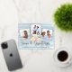 Enviar Navidades cálidos desde la playa con esta tarjeta personalizada de vacaciones costeras con 3 fotos y caligrafía de "Mares y saludos" impresa con Relieve metalizado de oro real. En el centro hay un grupo de conchas acuáticas, con un fondo de madera en la playa.