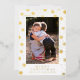 Tarjetas de Navidad bonito y simplista con una de tus fotos verticales favoritas en un marco metálico de copo de nieve. El texto es totalmente editable. El oro acentúa sobre un fondo blanco. Feliz Navidad!