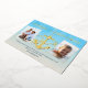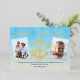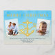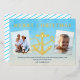 Esta tarjeta de Navidades con temática costera presenta un diseño náutico con un ancla entre dos fotos, un fondo acuático de playa y un mensaje de vacaciones con temática oceánica en la parte inferior. El texto del encabezado y el delimitador se imprimen con Relieve metalizado oro real.