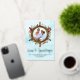 Una rueda de barco náutico enmarca la foto de esta hermosa tarjeta de Navidades costeros, con un fondo acuático. El Relieve metalizado oro real se utiliza para la caligrafía del guión "Seas & Greetings", así como para el marco de la rueda del barco.
