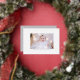 Glamorosas pinzas de Relieve metalizado en un fondo blanco resaltan tu foto favorita en estas tarjetas de fotos navideñas. Feliz Navidad y tus nombres en el fondo en moda plata, oro o rosa oro Relieve metalizado real. Alta definición para la mejor calidad de las fotos.