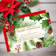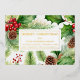 Un fondo festivo y elegante de pino, piñas, acebo y bayas es el telón de fondo perfecto para el saludo de su empresa y nombre, dirección, sitio web y número de teléfono. Una forma animada pero discreta de saludar a sus clientes en auténtico foil. Diseño de Holiday Hearts Designs (derechos reservados).