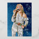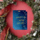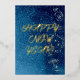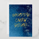 Eleva tus saludos para Feliz Año Nuevo con una tarjeta de papel de aluminio real. La celebración de texturas con tonos dorados produce un efecto excepcional. La ilustración en la parte frontal tiene brillo azul con motivos florales y estrellas en espiral. El reverso contrasta bellamente la foto con gráficos coincidentes. Utilice esta combinación de colores para cualquier foto familiar. El TEXTO Y LA IMAGEN se pueden personalizar con su elección de escritura/caligrafía.
