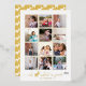 Oh ciervo qué año en revisión doce collage de fotos con lámina de oro auténtica Tarjeta de vacaciones. Una tarjeta de Navidad moderna con un collage de fotos de doce fotos con marco dorado, una para cada mes, y el mensaje: "Oh ciervo, qué año" en lámina de oro con un ciervo en lugar de la palabra querido. La parte trasera incluye un patrón de un ciervo blanco sobre dorado. Todas las fotos excepto una son de Fotografía © Storytree Studios, Stanford, CA