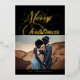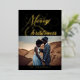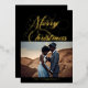 Un elegante diseño de Navidades con "Feliz Navidad" en un adorable guión de caligrafía con Relieve metalizado dorado. La foto especial de la pareja está en el frente con su nombre debajo, también en Relieve metalizado dorado. (Se puede elegir entre diferentes Relieves metalizados de color). El color de fondo es negro y personalizable. El reverso tiene una foto más pequeña y un mensaje personalizado en oro claro sólo color (no hay Relieve metalizado en el reverso).