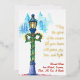 Esta hermosa tarjeta de Navidad cuenta con una pintura en acuarela festiva de un poste de lámpara decorado para las fiestas con guirnaldas y coronas. El título en letra script está impreso en lámina de oro y dice: ¡Que el espíritu de la temporada llene tu corazón de paz, alegría, amor y luz! La parte trasera es de un color rojo carmesí marmoleado profundo. ¡Una forma maravillosa de enviar saludos en esta temporada navideña!