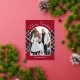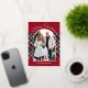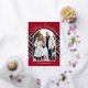 Esta elegante carta presenta un fondo rojo burdeos profundo, acentuado con un clásico borde de lona escocesa en rojo festivo, verde, negro y blanco. Personaliza tu foto familiar favorita, que será enmarcada en forma de arco rústico, y tu nombre o nombres debajo. El saludo "Feliz Navidad" y el nombre de su familia personalizado se resaltan en la tipografía del Relieve metalizado.
