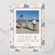 Saludos y Felicitaciones Tarjeta de vacaciones de hoja de oro rosa real con foto familiar y tarjeta de hoja de oro rosa real con conchas de mar en acuarela en azul y patrón de rubor de fondo. Tarjetas de fotos de vacaciones con tema de playa.