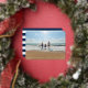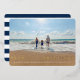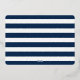 "Saludos y Mares" tarjeta de Navidad con tema náutico de papel metálico. La tarjeta cuenta con caligrafía elegante "y" con respaldo de patrón de rayas azul marino y blanco.