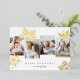 Unique modern holiday card design features four favorite photos arranged side by side with oversized gold foil snowflake silhouettes in the background. Personalize with your custom holiday greeting and family name(s) beneath in classic lettering; shown with "Merry Christmas."