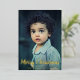 Envíe vítores de vacaciones con esta linda tarjeta de Navidades que incluye el saludo escrito a mano "Feliz Navidad" y copos de nieve dibujados con tiza sobre su foto familiar favorita. El texto y los copos de nieve en el frente están en Relieve metalizado de oro real. La parte posterior es un patrón suave de copos de nieve verde. Puede cambiar el color del fondo en la herramienta de edición de diseño.