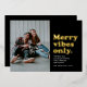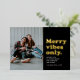 ¡Sólo en esta temporada de fiestas hay más alboroto! Envíe un divertido saludo de vacaciones al estilo retro con este único diseño de tarjeta de Navidades fotográficos verticales. El tipo de retroceso dice "sólo vibraciones alegres" en Relieve metalizado y también tiene espacio para un mensaje personalizado, nombre y año. La parte posterior de la coordinación tiene una textura angustiada para completar el aspecto vintage. Esta tarjeta de foto navideña en su moda negro y dorado seguramente se esparcirá con alegría a amigos y familiares y trabajará con una variedad de fotos.