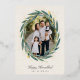 Envíe saludos de Hanukkah a amigos y familiares en estilo moda con nuestras elegantes tarjetas de fotos. Tu imagen vertical o vertical favorita está enmarcada por una corona de laurel oval de hojas de eucalipto color agua verde sobre un fondo de marfil cálido acentuado por estrellas de Relieve metalizado dorado. Personaliza con tu saludo de vacaciones personalizado y los nombres que están debajo.