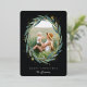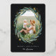 Send holiday greetings to friends and family in chic style with our elegant photo cards. your favorite vertical or portrait oriented image is framed by an oval laurel wreath of green watercolor eucalyptus leaves and gold foil stars on a dark background. Customize with your custom holiday greeting and names beneath in off-white lettering.