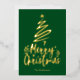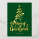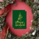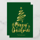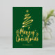 Relieve metalizado dorado Feliz Navidad estilo de escritura decorativo con un contorno de un árbol de Navidad y una estrella encima. Esta tarjeta de Navidad está diseñada para que puedas cambiar el color del fondo e introducir también el nombre de tu familia.