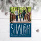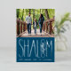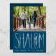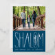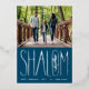 Verdadera letra de mano de Relieve metalizado "Shalom" con foto de paisaje en la parte superior. El color de la zona blanca es el personalizable y el reverso. Elija el color de su Relieve metalizado: oro, oro plateado o rosa, y color de fondo. Añade más fotos al fondo o escribe un mensaje.