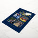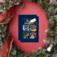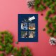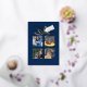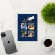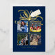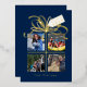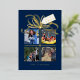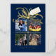 Tarjeta de vacaciones con foto azul marino para ayudar a recibir el año nuevo y mantenerse en contacto con familiares y amigos. Un regalo con 4 fotos en la portada y una cinta de lámina metálica de oro real, lazo y etiqueta con el año.