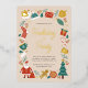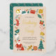 Celebre la temporada con nuestra tarjeta de vacaciones de Relieve metalizado de invitación a fiestas de Navidades festivos con ilustraciones de Santa Claus y decoraciones de vacaciones de invierno que incluyen pan de jengibre, holly, estrellas, kits y refrigerios de invierno, árbol y ornamentos de Navidad, regalos, canes de caramelo y más. Todo el texto se puede actualizar para crear una invitación de grupo personalizada que puede utilizar para cualquier fiesta con temas de Navidades. El reverso de la invitación presenta un verde azulado patrón de caña de caramelo verde.