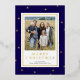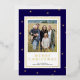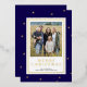 Celebrar el destello de Navidades elegantes con el envío de la tarjeta fotográfica azul moderno y Relieve metalizado dorado navideña esta temporada de vacaciones. La tarjeta única de vacaciones fotográficas cuenta con un rico fondo azul oscuro, hermosos puntos de Relieve metalizado dorado y un oro de lujo Feliz Navidad para hacer su brillo de saludo. Su foto está enmarcada con gusto en un rectángulo blanco opuesto, bordeado por un trazo de Relieve metalizado dorado. La parte trasera de la tarjeta termina con el aspecto clásico con el fondo azul oscuro. Una tarjeta perfecta para los amantes del minimalismo combinado con un toque de lujo.