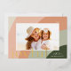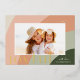 Moda y elegante diseño de tarjetas de vacaciones con una sola foto horizontal o orientada al paisaje en un diseño único de arcos, enmarcado por formas de rayas orgánicas en suaves tonos de melocotón y verde del bosque. "Alegre" aparece debajo de tu foto en un tipo subestimado, con el año en la parte superior. Personalice con su nombre familiar en la parte inferior derecha para el toque final perfecto a estas tarjetas de fotos 2022 para Navidades inspirados en la naturaleza.