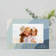 Moda y elegante diseño de tarjetas de vacaciones con una sola foto horizontal o orientada al paisaje en un diseño único de arcos, enmarcado por formas de rayas orgánicas en tonos suaves de azul. "Alegre" aparece debajo de tu foto en un tipo subestimado, con el año en la parte superior. Personalice con su nombre familiar en la parte inferior derecha para el toque final perfecto a estas tarjetas de fotos 2022 para Navidades inspirados en la naturaleza.