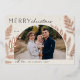 Moda y elegante diseño de tarjetas de vacaciones con una única foto horizontal o orientada al paisaje en un diseño único de arcos, adornado con un follaje botánico muy detallado en un Relieve metalizado de oro de lujo. "Feliz Navidad" aparece en la parte superior izquierda, con el nombre de tu familia al final. Una elección refinada inspirada en la naturaleza para sus saludos Navidades 2022.