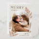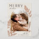 Moda y elegante diseño de tarjetas de vacaciones con una sola foto vertical o retrato en un diseño único en arcos, adornado con un follaje botánico muy detallado en Relieve metalizado de oro subió. "Feliz Navidad" aparece en la parte superior izquierda, con el nombre de tu familia en la parte inferior derecha. Una elección refinada inspirada en la naturaleza para sus saludos Navidades 2022.