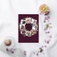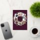 Un diseño de tarjetas vacacionales festivo que incluye ocho de tus fotos favoritas dispuestas en un diseño de corona circular acentuado por follaje color agua verde, conos de pino y bayas grises en un fondo de bayas oscuras. "Alegría" aparece en el centro en la tipografía festiva de guion con guijarros con letras de Relieve metalizado dorado. Personalice este diseño único de collage de fotos de vacaciones con los nombres y saludos de sus Navidades personalizados en la parte inferior.