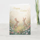 Una encantadora tarjeta de Pascua con dos preciosos conejitos en un prado lleno de flores silvestres. Los suaves colores pastel y el paisaje rústico crean un ambiente cálido y tranquilo.