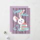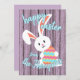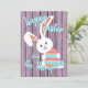 Bonito, moderno y moderno "Happy Easter" Temporada de primavera (primavera feliz) en una casa de campo rústica de color eslavanda violeta periwinkle con colores claros, con un fondo de madera de madera y un bonito conejo sonriente con un colorido huevo de Pascua. Con espacio para el personalizar o la personalización con el nombre de su familia y el texto de su elección en la parte delantera, y un mensaje de poema y nombres personales sentidos en la parte trasera que se pueden personalizar fácilmente con su propio texto de bienvenida.