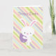 Un diseño de pascua dulce con un bonito conejito de Pascua personalizado con un huevo de Pascua en los brazos sobre un fondo de rayas pastel de primavera. Personalizar esto para hacer una carta única esta Pascua.
