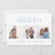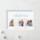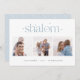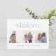 Envíe saludos de Hanukkah a amigos y familiares en estilo moda con nuestras elegantes tarjetas de fotos. Diseñada para acomodar tres de tus fotos cuadradas favoritas dispuestas una al lado de la otra en formato de collage, la tarjeta muestra el saludo de tu personalizado (mostrado con "Hanukkah alegre") y el(los) nombre(s) familiar(s) centrado(s) en la parte inferior. El saludo "Shalom" aparece en la parte superior con letras en serif muy unidas y acentuadas por estrellas diminutas.