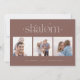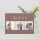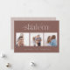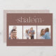 Envíe saludos de Hanukkah a amigos y familiares en estilo moda con nuestras elegantes tarjetas de fotos. Diseñada para acomodar tres de tus fotos cuadradas favoritas dispuestas una al lado de la otra en formato de collage, la tarjeta muestra el saludo de tu personalizado (mostrado con "Hanukkah alegre") y el(los) nombre(s) familiar(s) centrado(s) en la parte inferior. El saludo "Shalom" aparece en la parte superior con letras en serif muy unidas y acentuadas por estrellas diminutas.