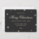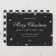Tarjeta de vacaciones de color negro y blanco con fondo de manto negro y blanco adornado con copos de nieve y estrellas.
