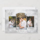 Este diseño festivo incluye tres plantillas de fotos para fotos con orientación vertical, la central con forma de arco elegante y campos de texto editables. El fondo cuenta con un cielo de nieve de plata y blanco con chispas blancas y copos de nieve. En la parte posterior se muestran el fondo complementario y la etiqueta en blanco con campos de texto adicionales.