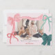 Celebre la temporada con estilo con esta encantadora tarjeta de fotos navideña inspirada en el coqueta, con arcos dibujados a mano, colores suaves y un diseño romántico y lleno de cintas. La parte delantera incluye tu imagen favorita enmarcada por cuatro arcos dibujados a mano: una cinta rosa audaz con rayas rojas, una cinta verde con rayas navales y dos acentos más pequeños en rojo y verde clásico. La parte posterior ofrece un suave fondo gris de neblina de eucalipto/menta con un delicado patrón de arco.